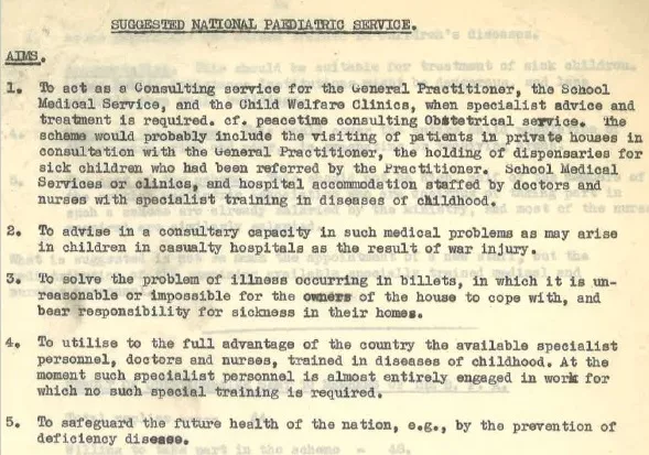 The war took place before the foundation of the NHS in 1948, and so was a time the BPA advised on how health services could cope with the new challenges. One proposal was for a National Paediatric Service with the aims of: