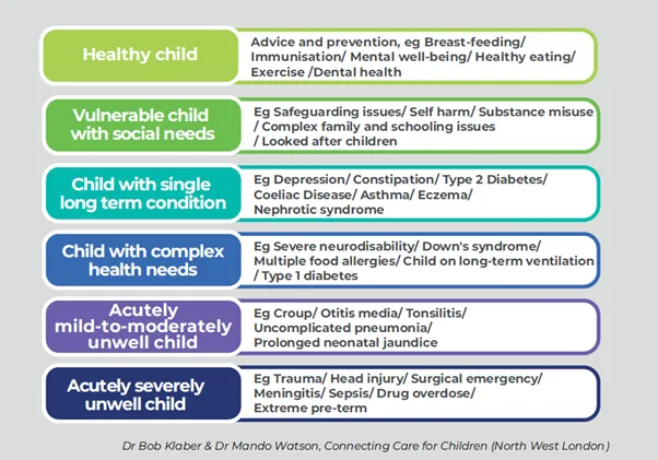 The philosophy underlying the training and the curriculum within paediatrics is known as the “Whole Population Approach”. This incorporates six segments as shown below.