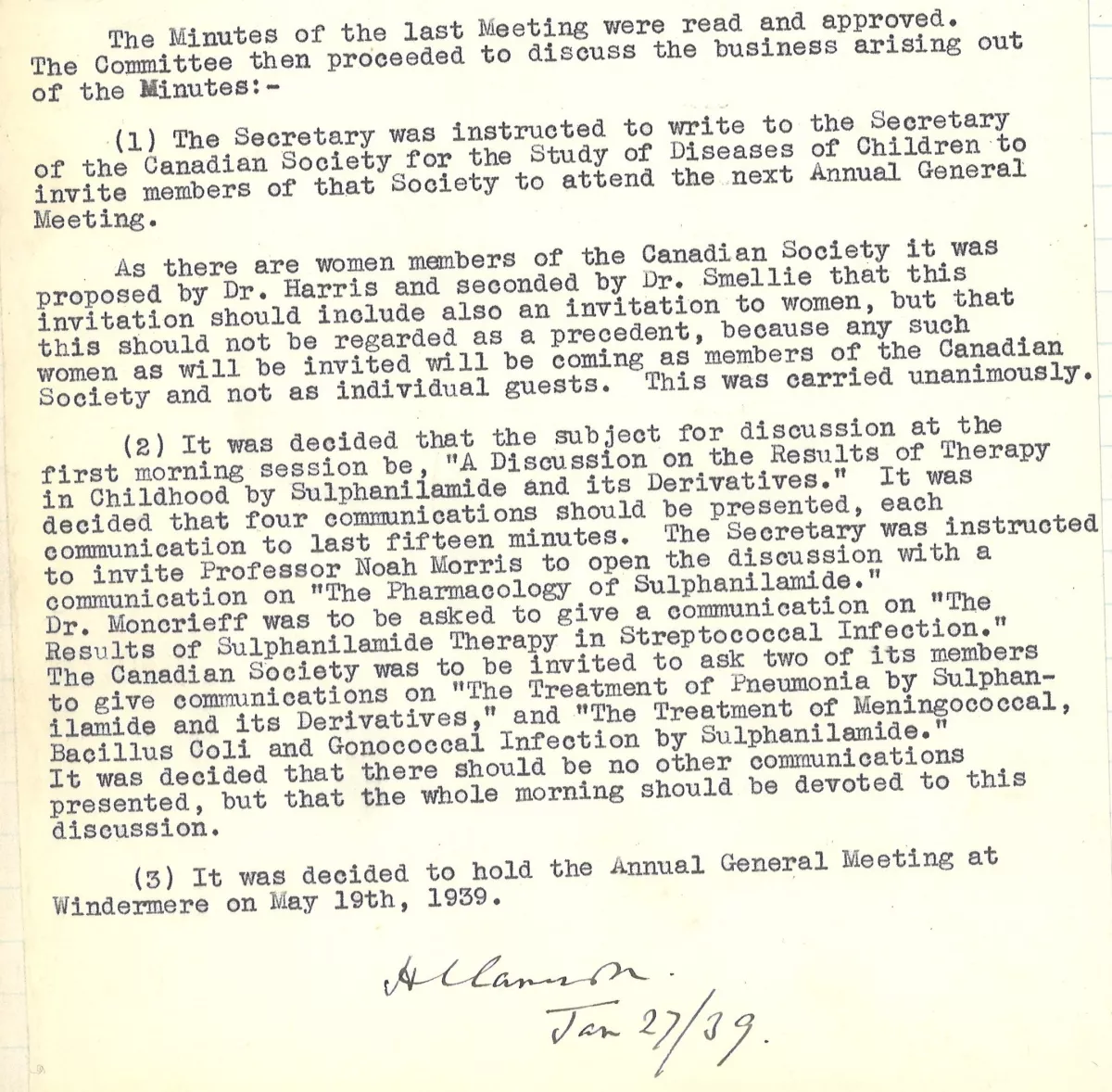 Excluding women from the BPA led to a difficult situation in 1938 when the BPA planned a joint meeting with the Canadian Society for the Study of Disease in Childhood (now the Canadian Paediatric Society). Women were allowed to be members of the Canadian society but not in the British Association, so the BPA were in a situation where they were treating Canadian female doctors as their equals, but not the women they worked with. At a meeting of the Executive Committee, it was unanimously decided that female members of the Canadian Society would be invited to the meeting as they would be coming as members rather than individual guests. It was stated that “this should not be regarded as a precedent”.