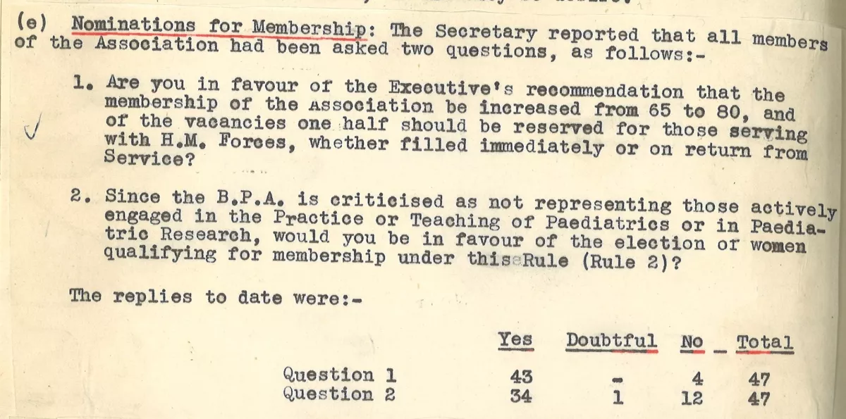However, opinion did change and in 1944 a vote was taken at a meeting of the Executive Committee on whether to admit women as members. The minutes state that the BPA was “criticised as not representing those actively engaged in the Practice or Teaching of Paediatrics or in Paediatric Research.”