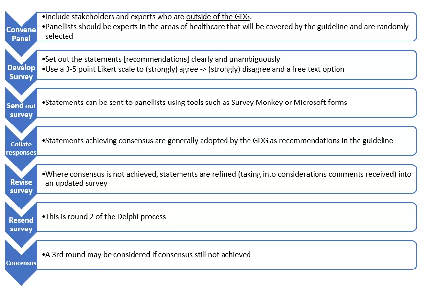 - Make recommendations using formal consensus techniques, such as Delphi - see the Delphi process summary flowchart figure below. Using this technique introduces rigour and objectivity, reduces risk of bias and allows an assessment of likely implementation of recommendations.
