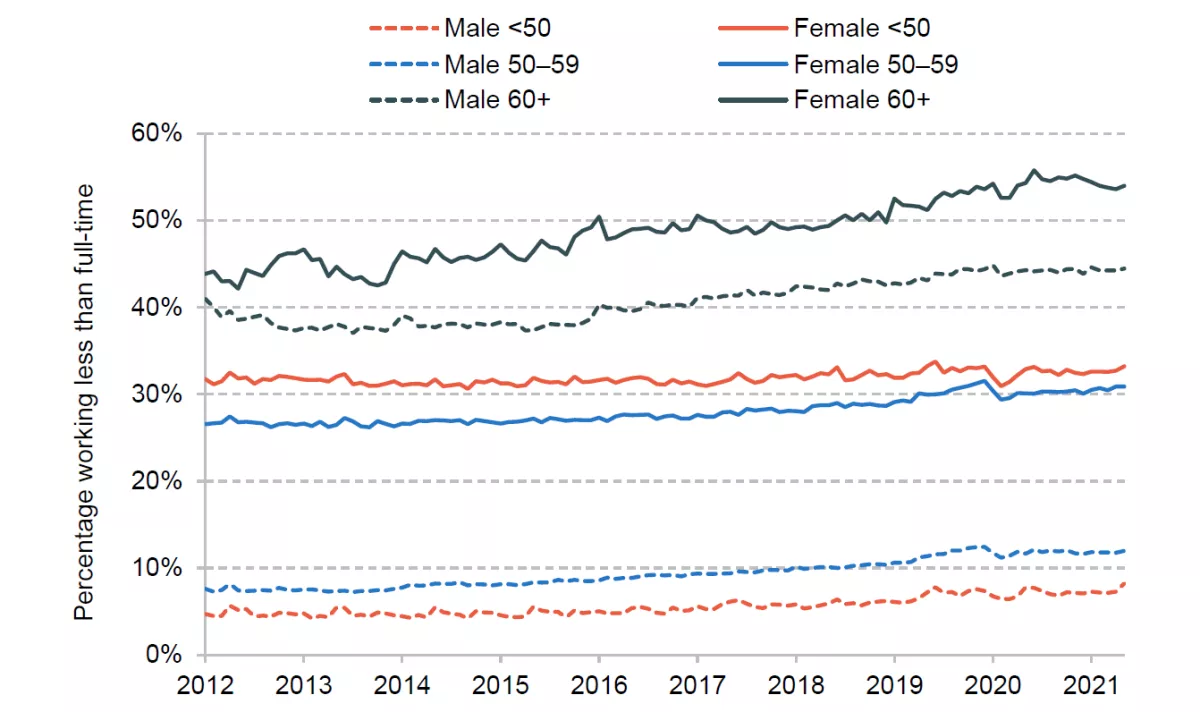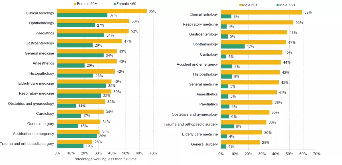 The changing age and gender of the paediatric workforce explains almost half of the increase in LTFT working from 2012 to 2021. While female consultants are more likely to work LTFT, this difference narrows with age. Around 30% of female consultants under 60 work LTFT compared to 10% of male consultants, but at 60-64 years, the gap closes significantly with 34% of male consultants and 45% of female consultants working LTFT (IFS, 2023, p13).