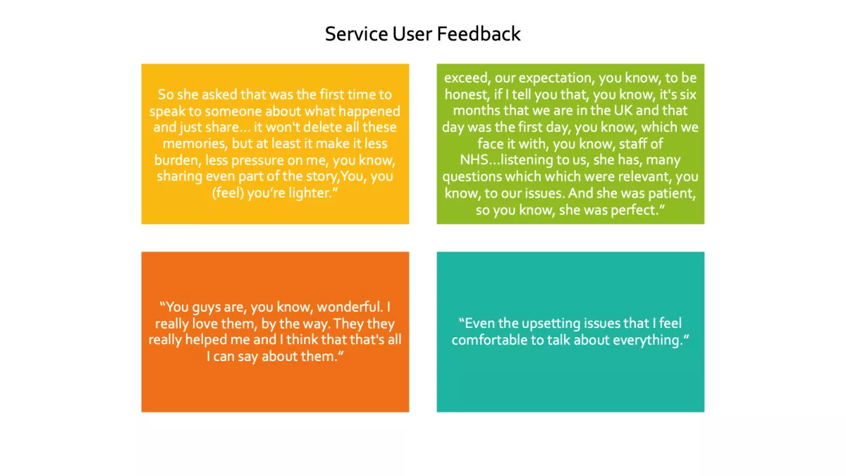 - Parent/child: “The support we got was above and beyond we couldn't of asked for more support than we got to help us support my stepdaughter the best way possible and advice on the best way to do things for her she's now on road to recovery fully and is doing amazing”