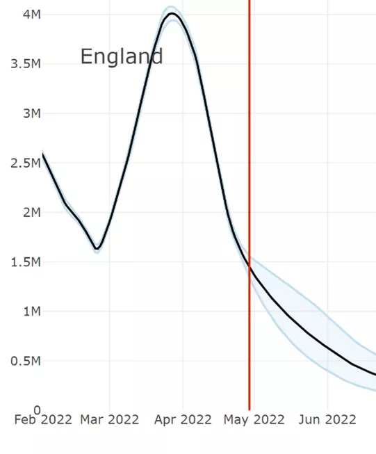 - Rates of SARS-CoV-2 have reduced markedly the UK, with prevalence <1% by end of May 2022 (UKHSA data):