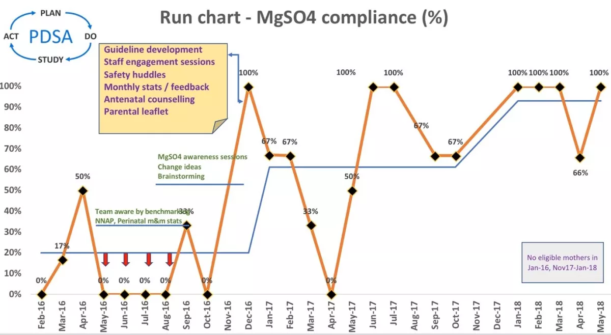 Our improvement journey started in 2016, when we became aware that our neonatal service was an outlier for antenatal magnesium sulphate (MgSO4) administration with an uptake of about 20%, which was far below the national average (43%).