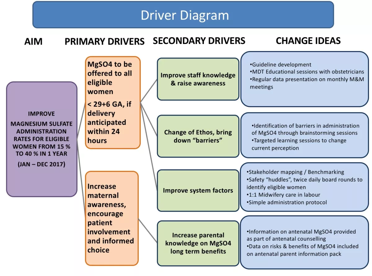 Using the Institute of Healthcare Improvement (IHI) model we aimed to increase the uptake of MgSO4 in eligible preterm deliveries. Improvement was defined as an increase in the uptake of MgSO4 from 15% in 2016 to 40%, hence reaching the then national average.