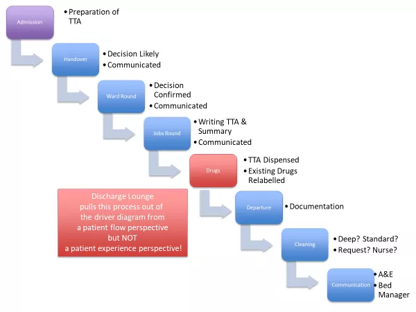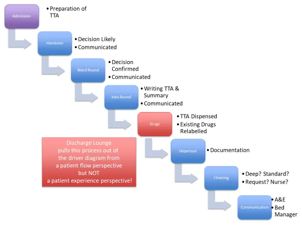 A ‘discharge lounge’ was already intermittently available, dependent on staffing levels. A ‘discharge culture’ of pre-emptive discharge summaries and TTA (to take away) -writing was encouraged. Patient transport times and cubicle cleaning times were somewhat out of our hands.